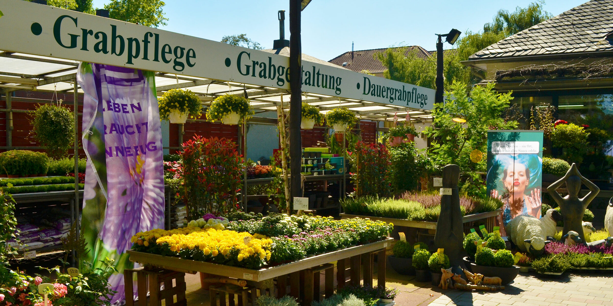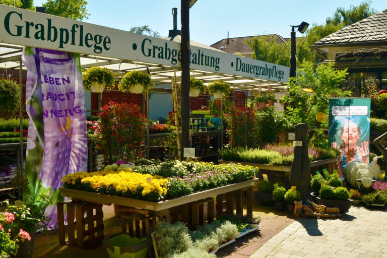 Im Außenbereich bieten wir je nach Saison Staudenpflanzen, Sträucher und Bäume in reicher Auswahl, können aber auch recht kurzfristig Gartenbepflanzung bestellen. Wir führen Figuren der Firma Vidroflor